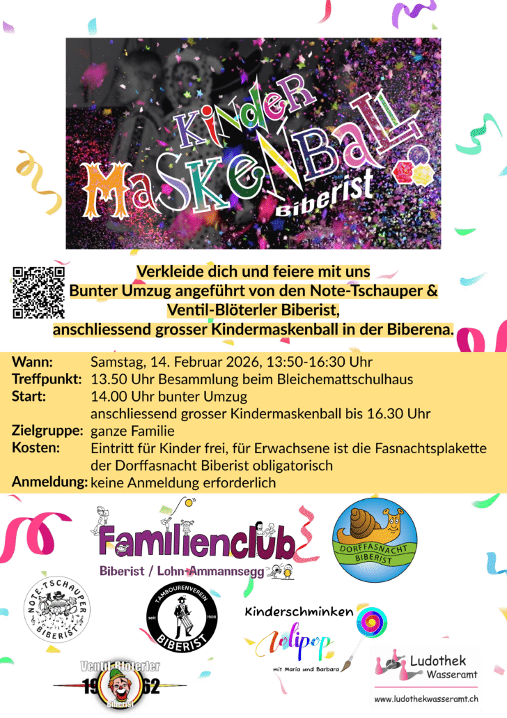 Bunter Umzug angeführt von den Note-Tschauper & Ventil-Blöterler Biberist, anschliessend grosser Kindermaskenball in der Biberena. 🥳